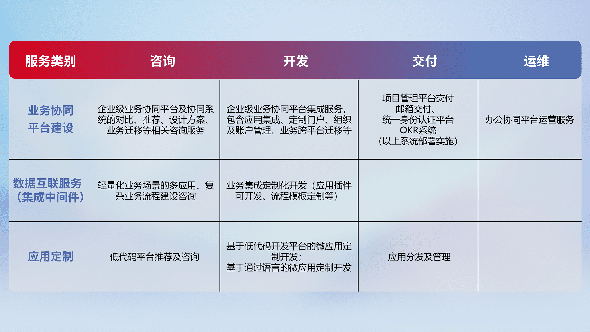 针对钉钉、、、、企微、、IDaas等平台级产品提供产品的规划、、、、方案、、交付、、、定制化开发等服务,,实现如统一协同办公、、、、智能客户服务、、混合会议管理、、智能数据查询、、、、等业务场景,,,,实现数字化转型。。。。